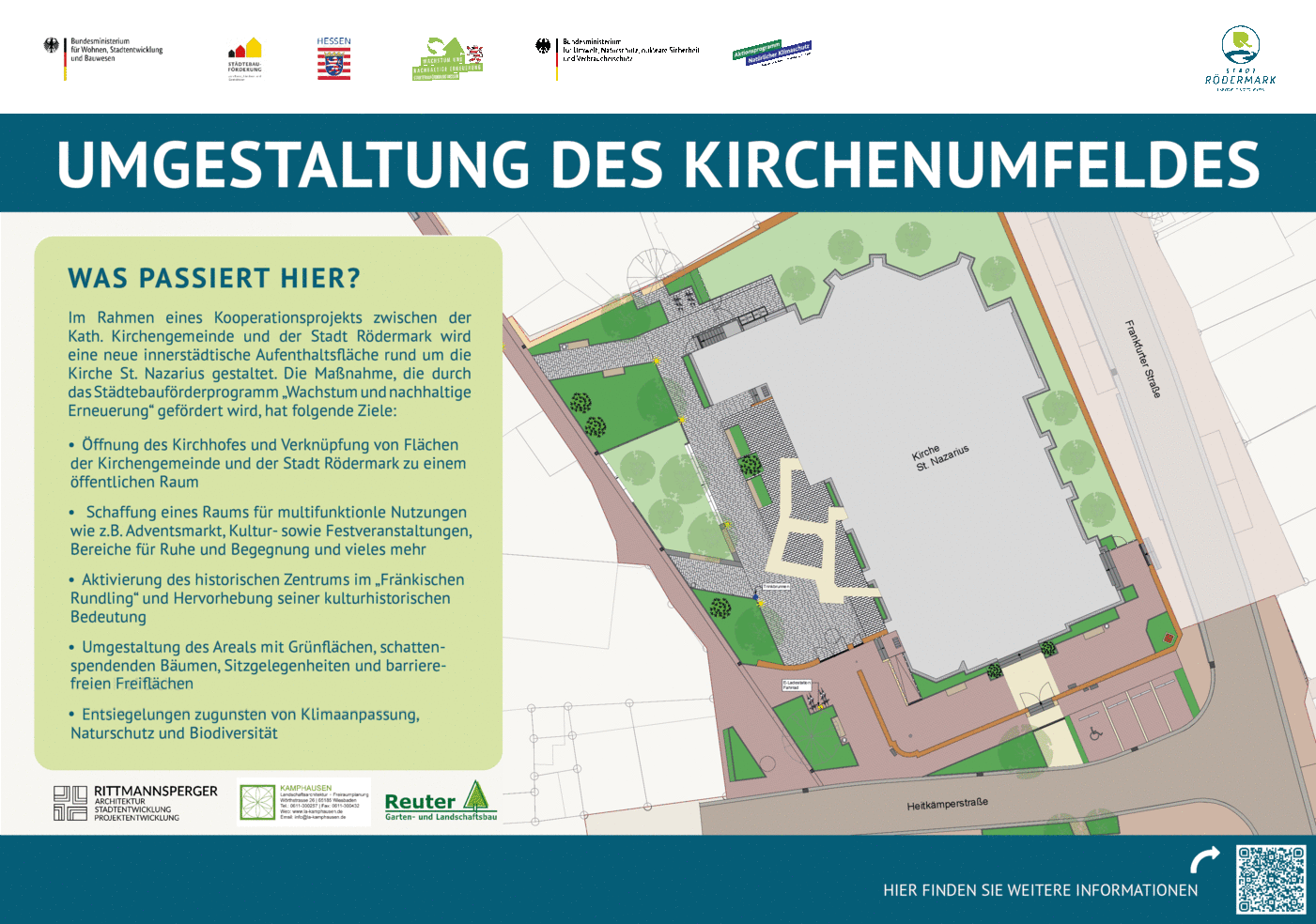 Hauptziel der Maßnahme "Neugestaltung Kirchenumfeld" ist die Herstellung eines öffentlichen Platzraums im Bereich westlich und südwestlich des Kirchengebäudes St. Nazarius und dessen Verknüpfung mit der Umgebung. Die zu beplanenden Flächen befinden sich sowohl im Besitz der Kirche als auch der Stadt Rödermark. Im Rahmen eines Kooperationsprojekts zwischen der Kirchengemeinde und der Stadt Rödermark soll nun ein neuer attraktiver innerstädtischer Aufenthaltsbereich gestaltet und umgesetzt werden.